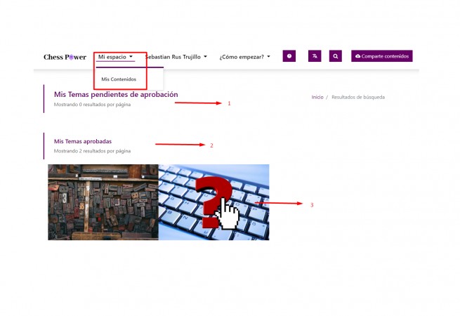 Cuando hemos iniciado la sesión, aparece el menú "Mi espacio" y debajo de el "Mis Contenidos" al presionar acá veremos la lista de Temas pendientes de aprobación y los que ya están aprobados.